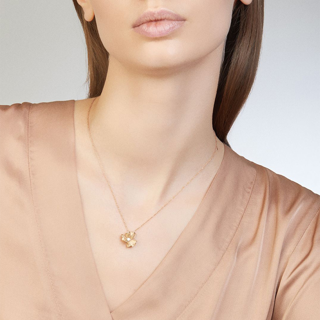 Elegante collana con ciondolo a forma di fiore che da il nome alla collezione Grace. Oro beige sabbiato con bordi lucidi che esaltano il movimento e la delicatezza del gioiello. Il ciondolo è impreziosito con un diamante incastonato al centro. Un gioiello unico, interamente realizzato in Toscana.